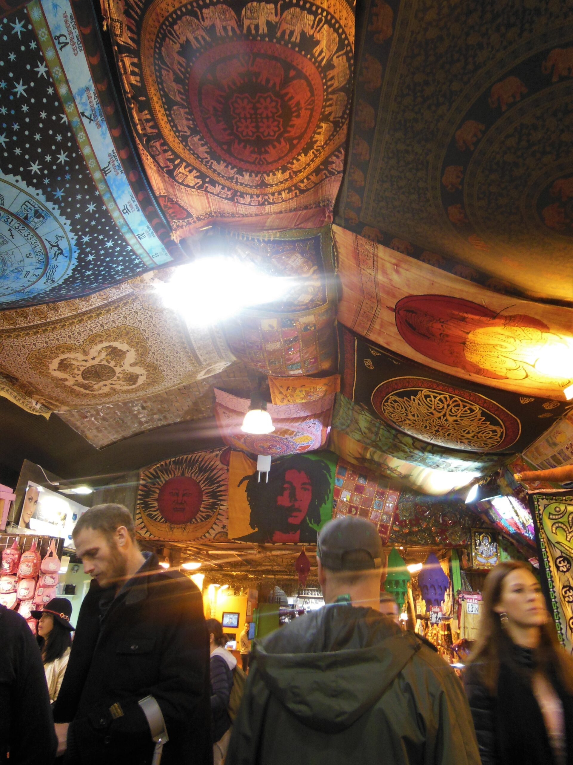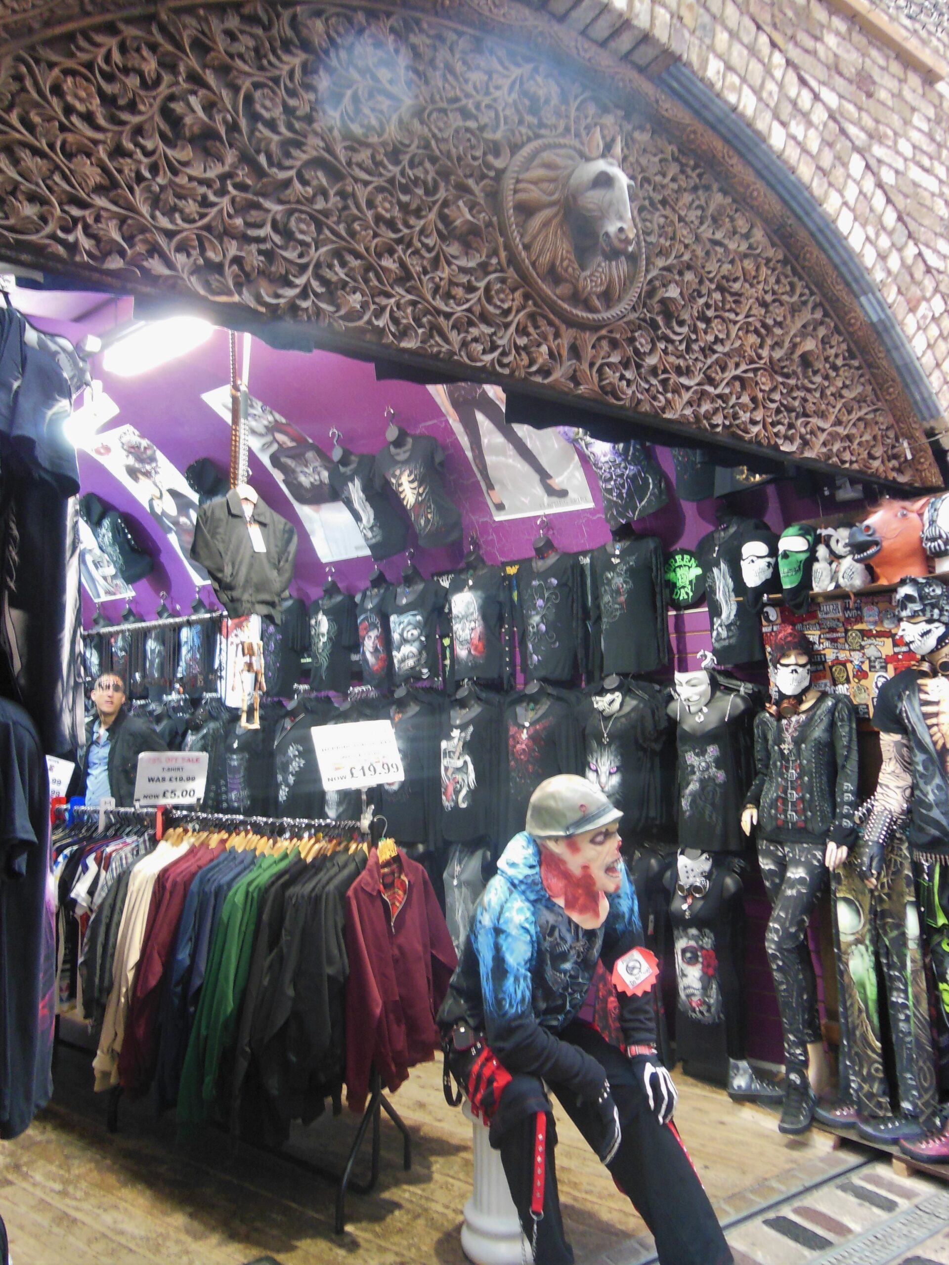 Le quartier est immense. On pourrait facilement y passer toute la journée sans s’ennuyer. On y trouve aussi bien des boutiques de vêtements que des magasins d’accessoires divers, des marchés couverts ou à ciel ouvert, des étals variés, des bars, des restaurants… Nous passons de l’atmosphère chaleureuse des allées de street-food du monde entier dans le marché de Camden, à un bar immense déjà décoré pour Halloween avec des têtes et des corps découpés pendants du plafond (Proud Camden), puis à des boutiques d’antiquités dans Stables Market (les anciennes écuries de Camden) avant de découvrir l’atmosphère futuriste et très osée de Cyberdog…